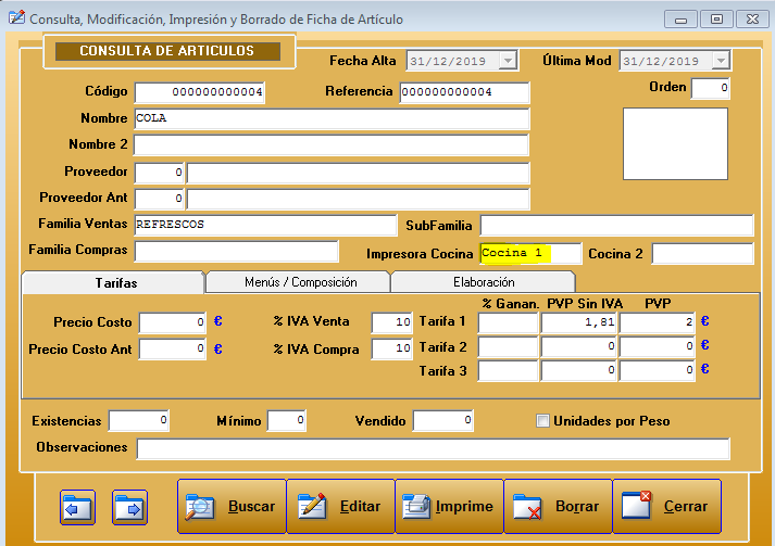 Una vez configuradas las impresoras de cocina, debes indicar en cada artículo la impresora por la que quieres que se imprima, entrando en el menú 3.Artículos > 2.Consultar Artículo, seleccionado en artículo deseado y pinchando en el botón editar, para poder seleccionar la impresora de cocina deseada. Una vez seleccionada, haz clic en el botón grabar.