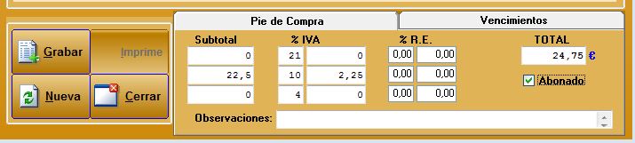 Luego, la compra se puede dar de alta desde el menú 4.Compras > 2.Facturas compras > 1.Anotar compra. Tras indicar el proveedor y los productos, hay que pulsar "abonado" si se ha realizado el pago, y esto contará en el cierre de caja en el apartado "Compras".