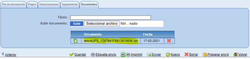 Una vez hayamos rellenado esos datos se nos generará el pedido en UPS y en los documentos se habrá creado la etiqueta en formato ZPL (está en ZPL por defecto, pero se puede cambiar a otro formato).